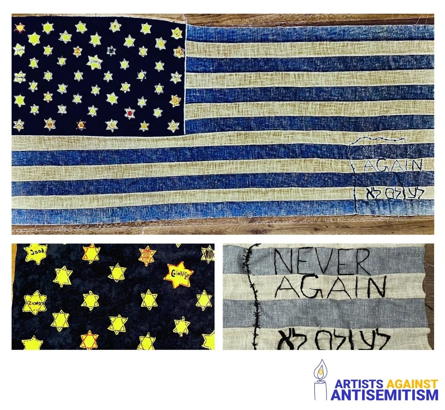 About the artists: Lifelong friends who first met at the Jewish Community Center in New Orleans, Caren Ann Appel and Erin Shapiro DiManno came together to collaborate on this fabric art piece, to share their heartbreak over the alarming rise of antisemitism here in the US.